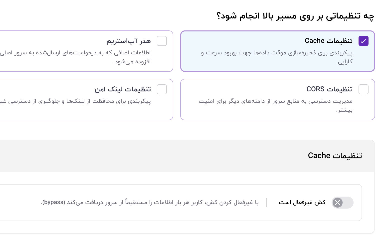 ابتدا برای هرمسیر باید «نوع Cache» مشخص شود، «نوع Cache» در اینجا تعیینکنندهی رفتار کش است. در این قسمت میتوانید یکی از سه سطح «استاندارد»، «Bypass» و یا «نادیده گرفتن Query String» را انتخاب کنید.