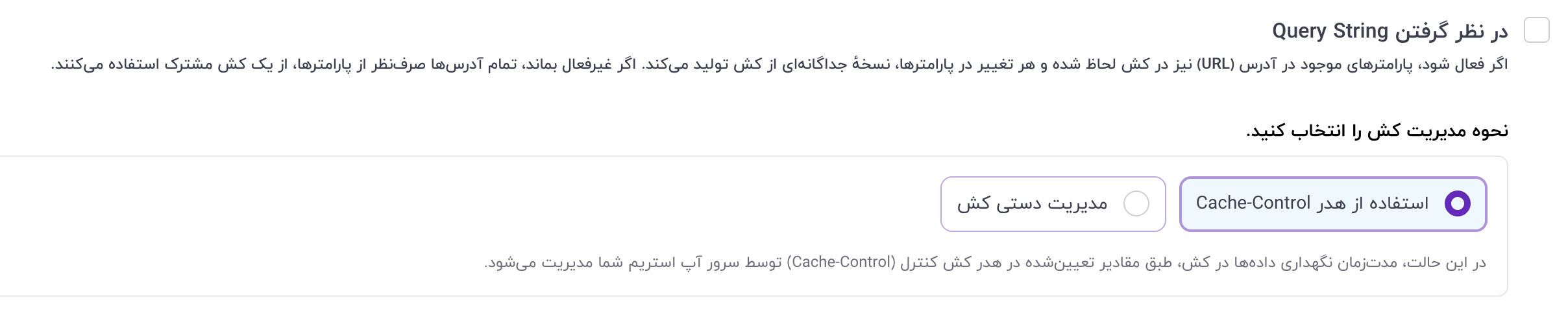 اگر غیرفعال باشد: CDN بخش Query String را نادیده میگیرد. در مثال بالا، هر دو درخواست یک فایل کششده را دریافت خواهند کرد. این گزینه برای زمانی مفید است که Query Stringها برای شما اهمیتی ندارند (مثلاً پارامترهای UTM تبلیغاتی) و نمیخواهید بیهوده نسخههای تکراری در کش ایجاد کنید.