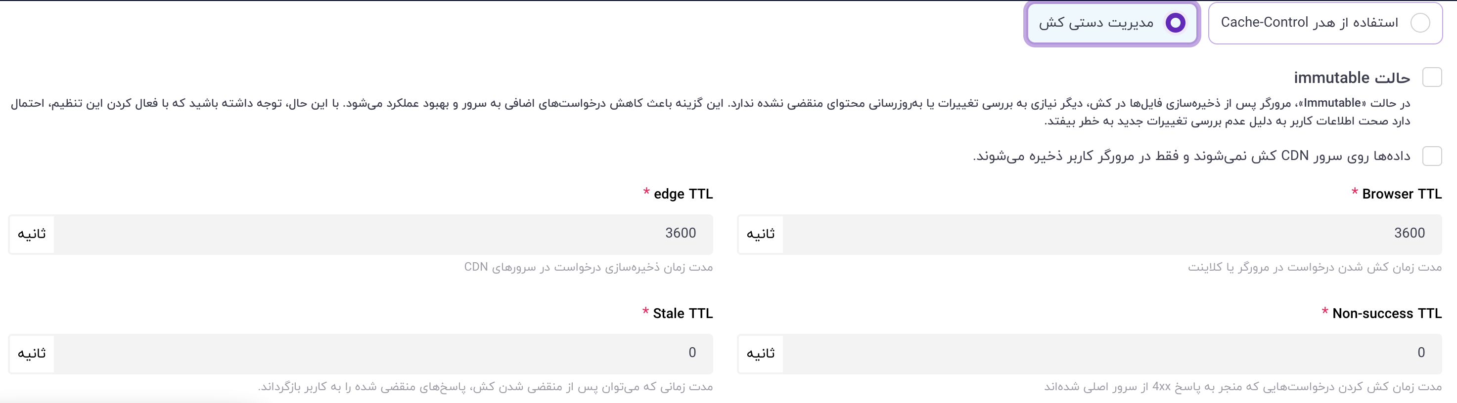 مدیریت دستی کش (تصمیمگیری در پنل ستون): در این حالت، شما هدرهای ارسالی از سرور اصلی را نادیده گرفته و تمام قوانین کش را مستقیماً در همین پنل تعریف میکنید. تنظیمات بعدی فقط در این حالت نمایش داده میشوند.