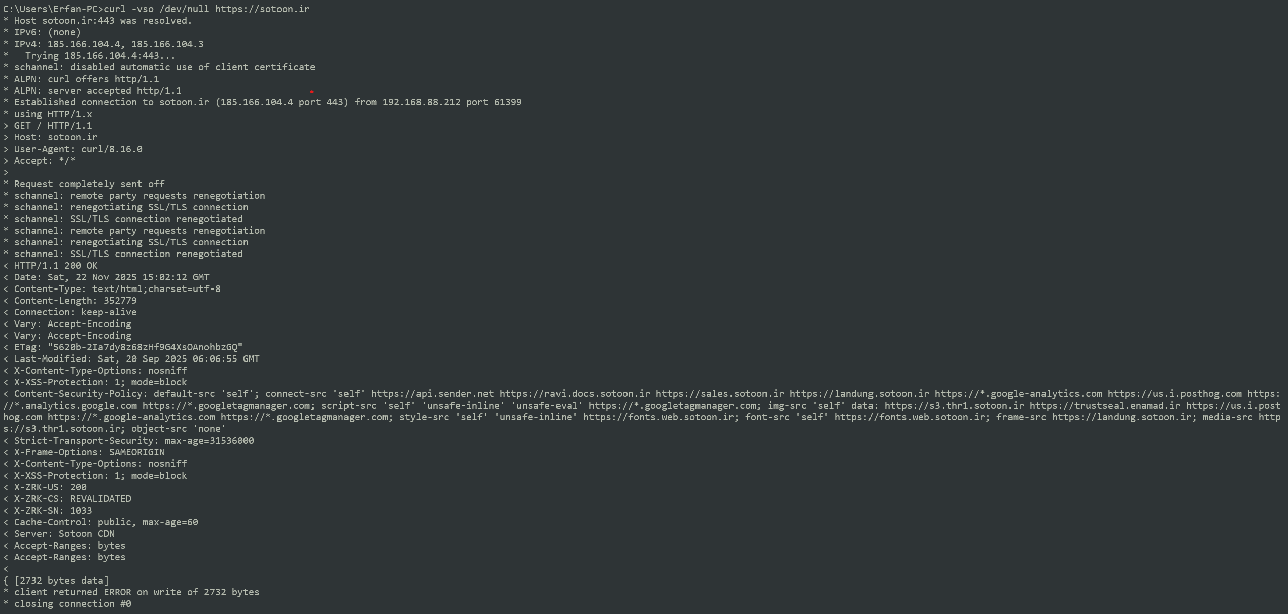 پس از نصب برنامه وارد ترمینال (terminal) شوید و دامنه ی مورد بررسی خود را به همراه پروتکل مورد نظر که http یا https میباشید برای تست اجرا نمایید و از خروجی به طور کامل اسکرین شات تهیه نمایید. برای مثال تست برای دامنه sotoon.ir به شکل زیر وارد شده است: curl -vso /dev/null https://sotoon.ir