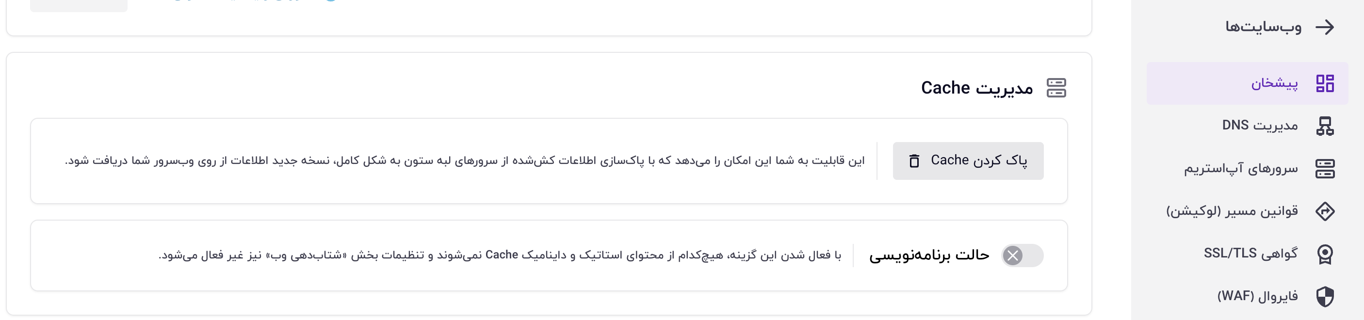 - در بخش پیشخان با کلیک روی دکمهی پاکسازی کش (purge) دو گزینه نمایش داده میشود.