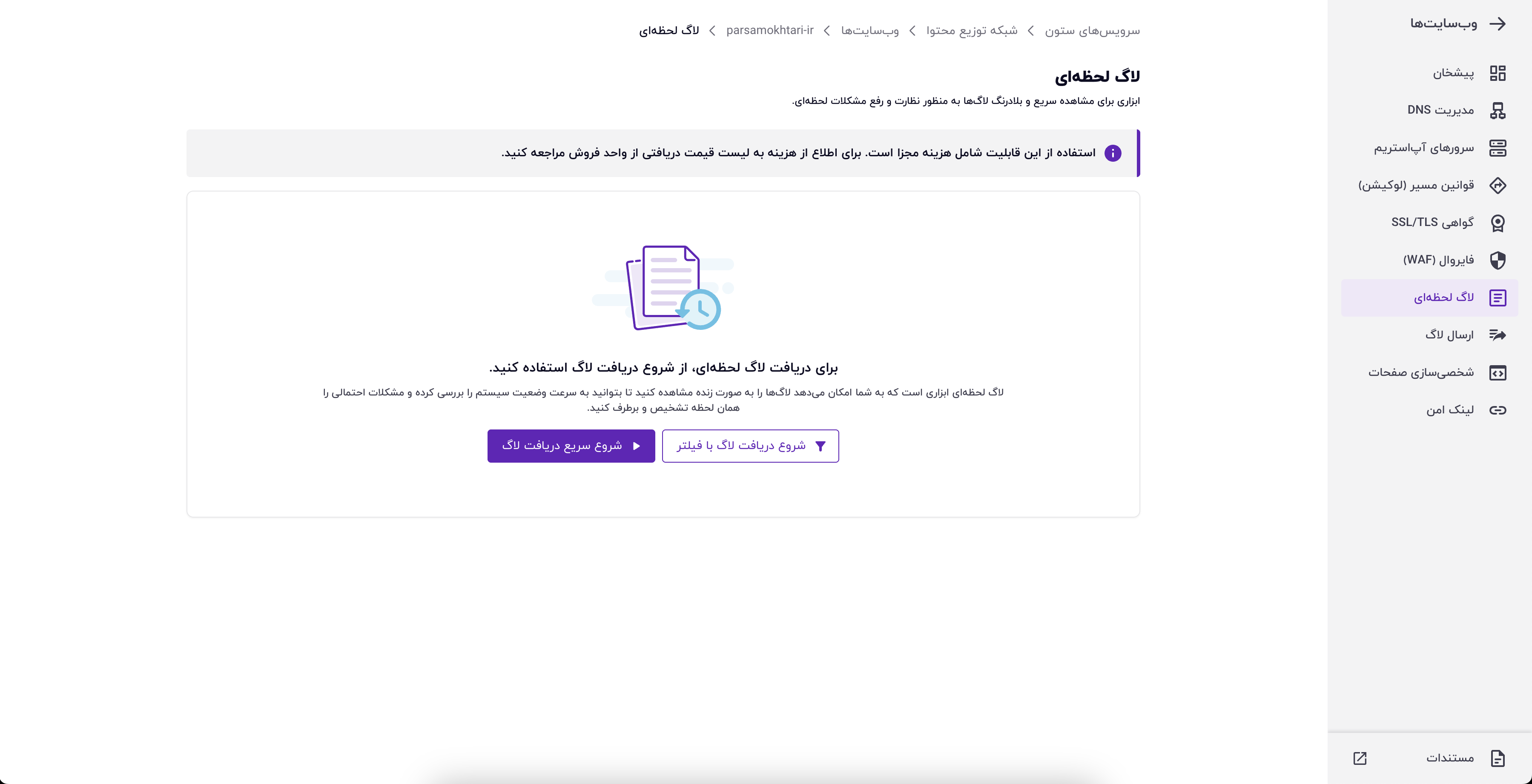 برای استفاده از این ابزار، از منوی «لاگ لحظهای» وارد شوید و با انتخاب دکمه «شروع سریع دریافت لاگ» منتظر نمایش لاگها بمانید. توجه داشته باشید که با توجه به میزان ترافیک وبسایت شما، نرخ ارسال لاگها ممکن است متفاوت باشد. برای مشاهده لاگها، چند درخواست به وبسایت ارسال کنید و تا زمانی که لاگها در لیست نمایش داده شوند، این صفحه را باز نگه دارید.