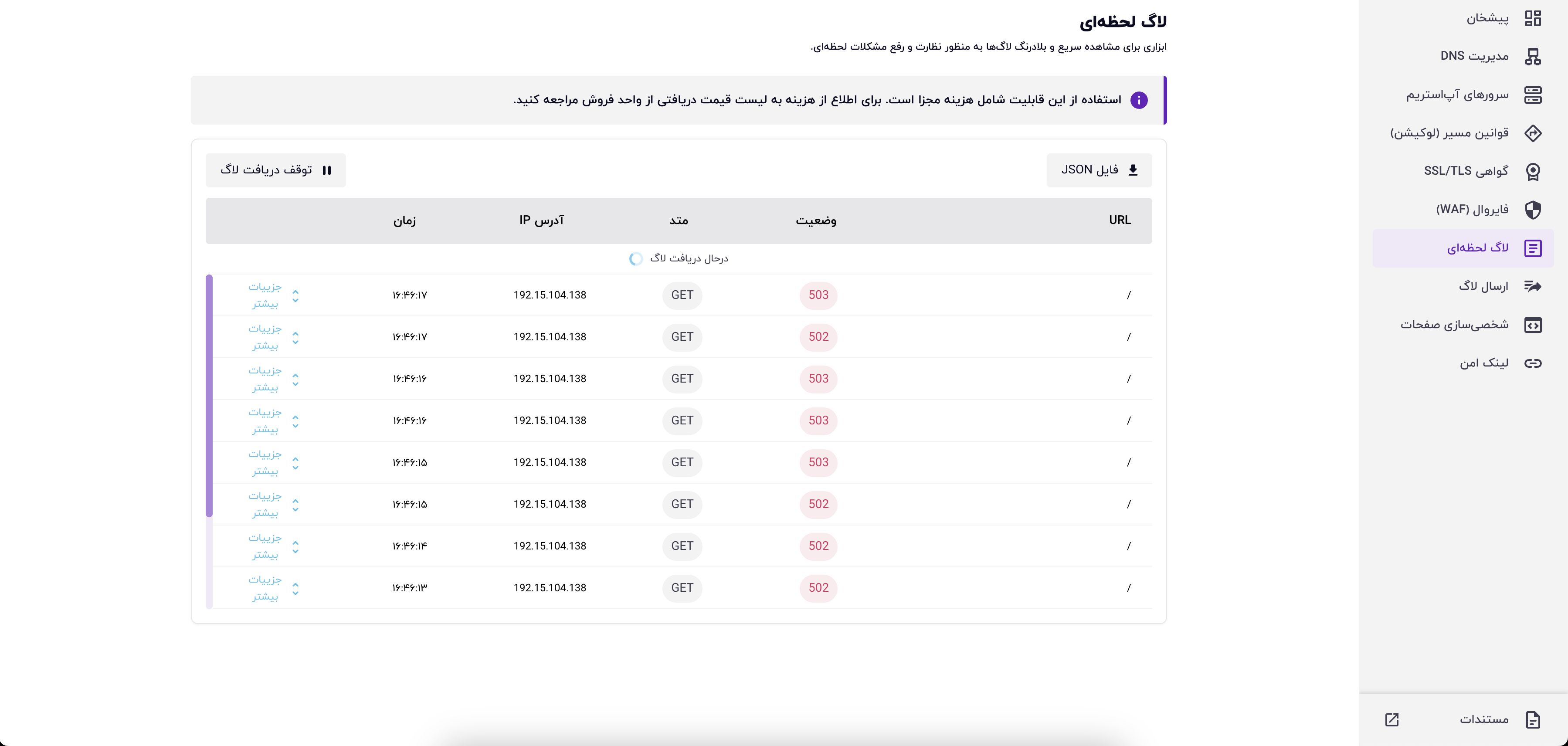 همچنین برای دریافت کامل فهرست فعلی لاگهای دریافتشده میتوانید از گزینه «فایل JSON» استفاده کنید و در صورت نیاز آن را با تیم پشتیبانی به اشتراک بگذارید.