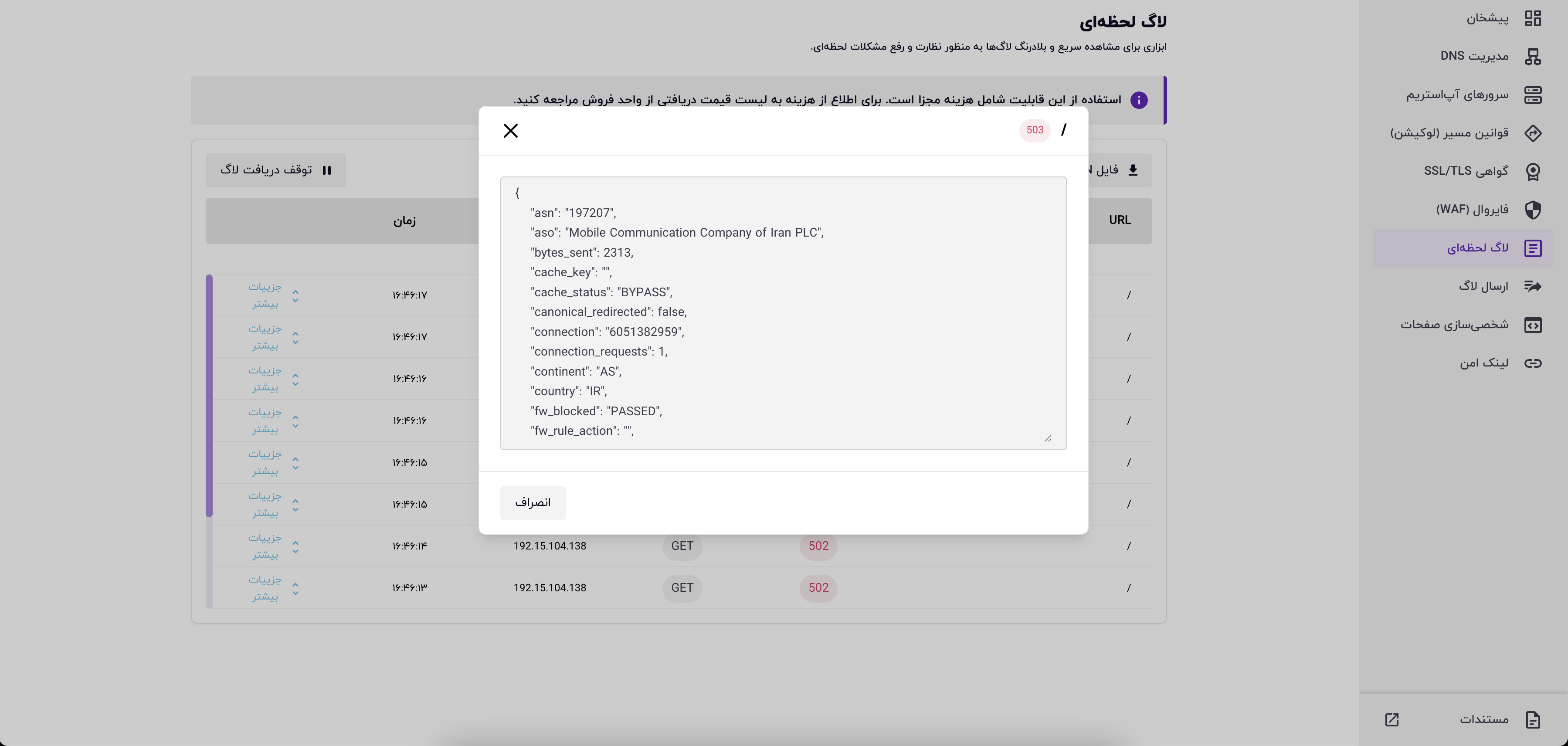 با استفاده از گزینه «جزئیات بیشتر» میتوانید اطلاعات کامل لاگ مورد نظر را مشاهده کرده و در صورت نیاز آن را با تیم پشتیبانی به اشتراک بگذارید.