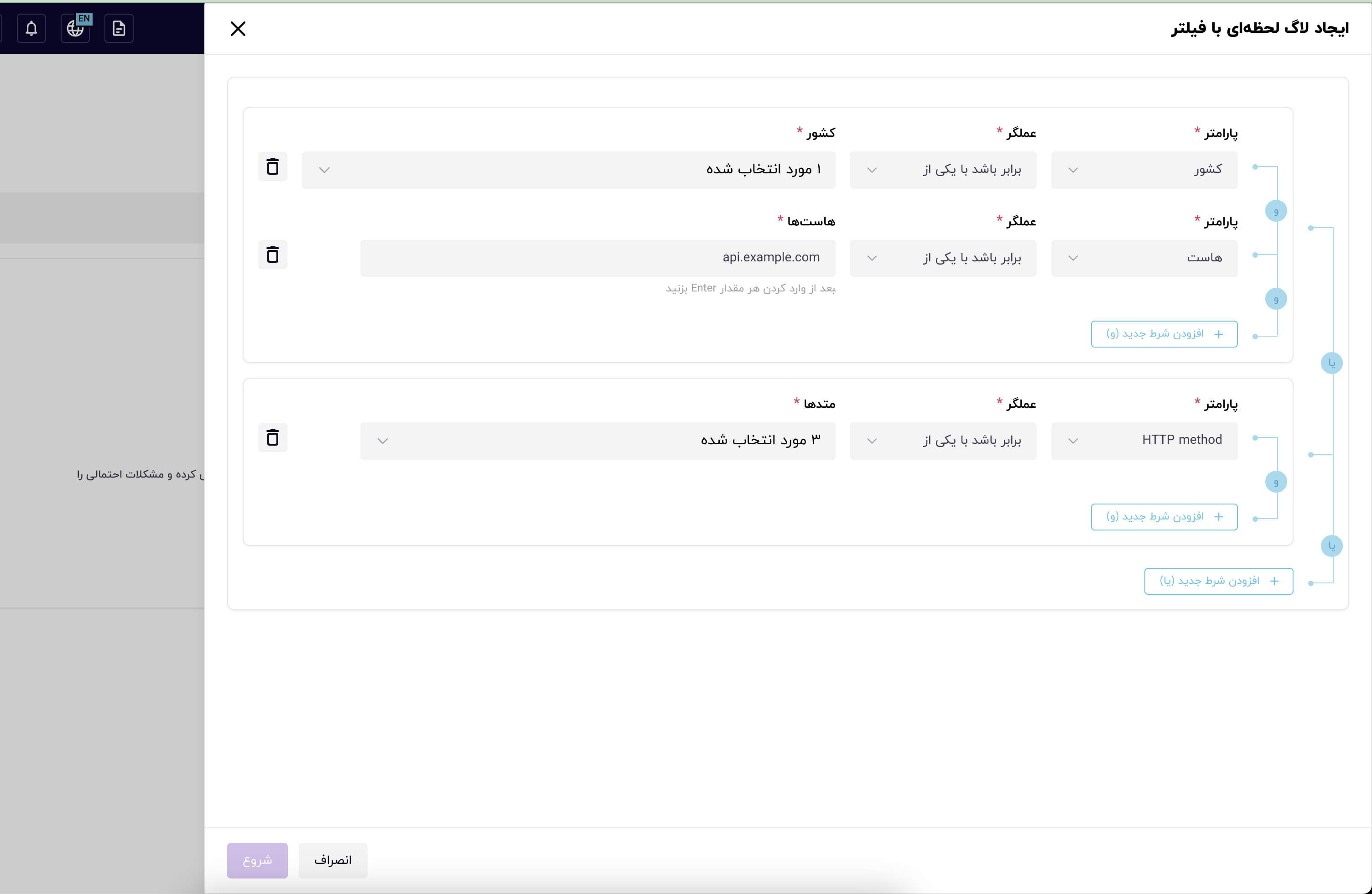 همچنین میتوانید با استفاده از گزینه «شروع دریافت لاگ با فیلتر»، فیلترهایی بر اساس ویژگیهای درخواستها تعریف کنید تا فقط لاگهایی نمایش داده شوند که با شرایط تعیینشده مطابقت دارند.